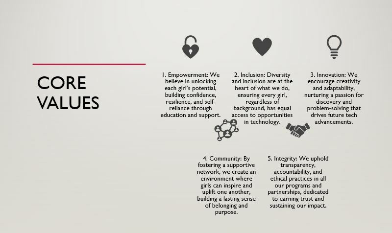 "Our mission is to inspire and equip underserved girls with essential technology skills, fostering an inclusive digital future. We provide accessible education, mentorship, and opportunities, building a foundation where girls thrive, break barriers, and become the tech leaders of tomorrow."